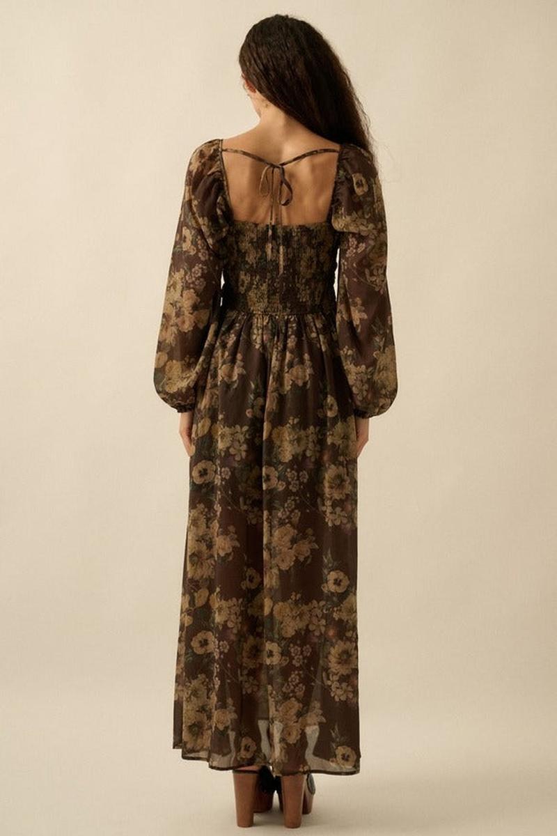 Embrace timeless elegance with this floral-print chiffon maxi dress featuring a flattering V neckline with delicate ruffles and a gathered bodice that enhances your silhouette. The contrasting velvet trim adds subtle sophistication, while long bubble sleeves with elastic cuffs offer comfortable coverage. A smocked elastic back and low back with tie closure ensure a perfect, relaxed fit. The high waist and ankle-length design, paired with a sleeveless thigh-length lining, make this dress effortlessly graceful for any occasion. Perfect for those seeking a romantic and chic statement piece.