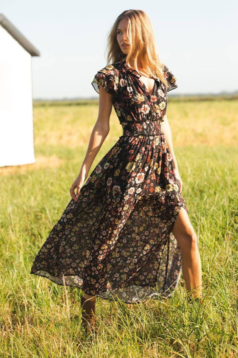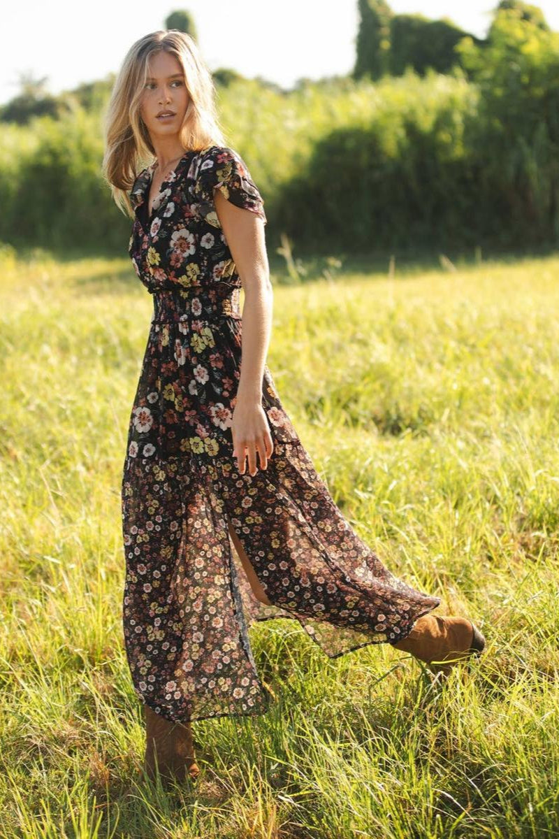 Experience effortless elegance with the Lovestitch Ruffle Sleeve Smocked Waist Maxi Dress. Its floral chiffon fabric flows beautifully, enhanced by a ruffled split neckline and fluttery short sleeves that add a touch of romance. The smocked waist flatters your figure, while the tiered skirt with a front slit offers graceful movement and comfort. Finished with delicate baby-hemmed sleeves and a clean stitched hem, this dress seamlessly combines romantic charm with everyday wearability. Perfect for any occasion where style meets ease.