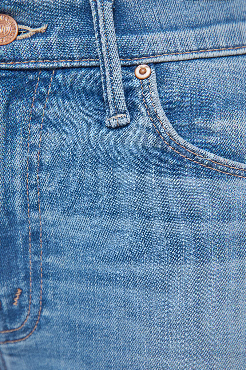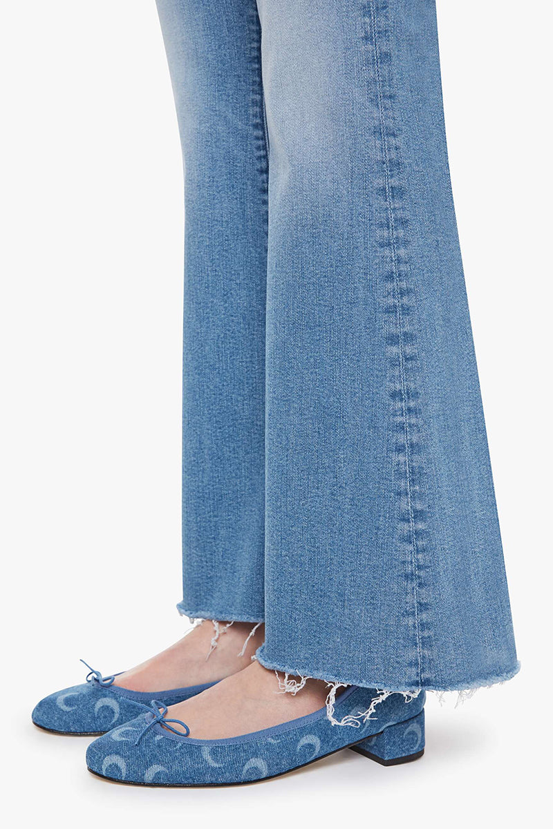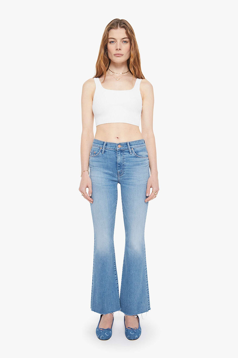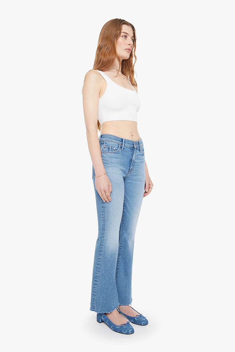 Experience effortless style with the Mother Denim Weekender Fray in Ride Hard, Live Louder. These mid-rise flares feature a flattering 32.25-inch inseam and a trendy frayed hem for a modern edge. Crafted from recycled stretch denim, they offer comfort with a conscience. The light blue wash includes subtle whiskering and fading at the knees, adding character to every step. Perfect for mixing casual cool with timeless denim appeal.