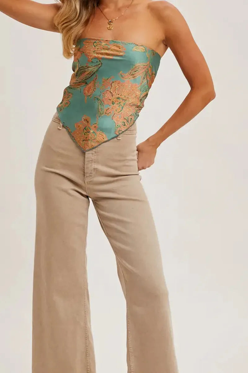 Elevate your style with Bluivy's Paisley Satin Bandana Tube Top in Teal. The sleek satin fabric and classic paisley print exude a chic, bohemian vibe. Featuring a flattering, strapless fit and bandana-style cut, this top is perfect for pairing with high-waisted bottoms. The silky material adds a luxurious touch, making it a must-have for any fashion-forward wardrobe.